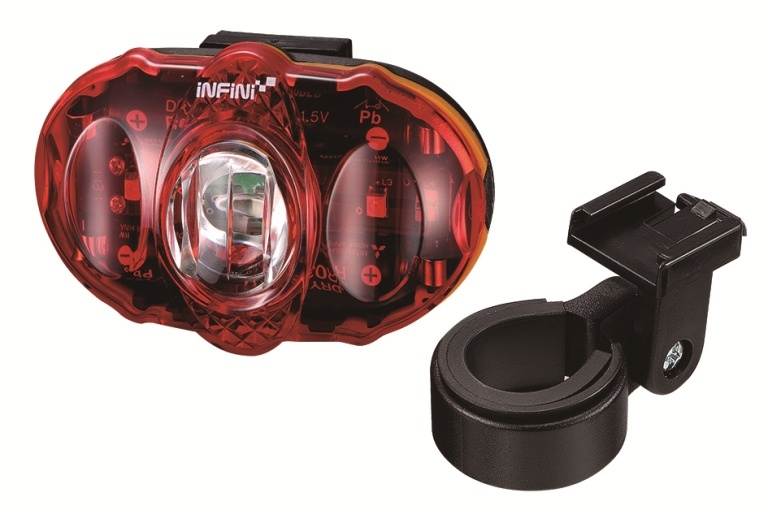 Baglygte med 3 røde LED. Konstant lys eller blink. Batterier: 2xAAA (inkluderet)