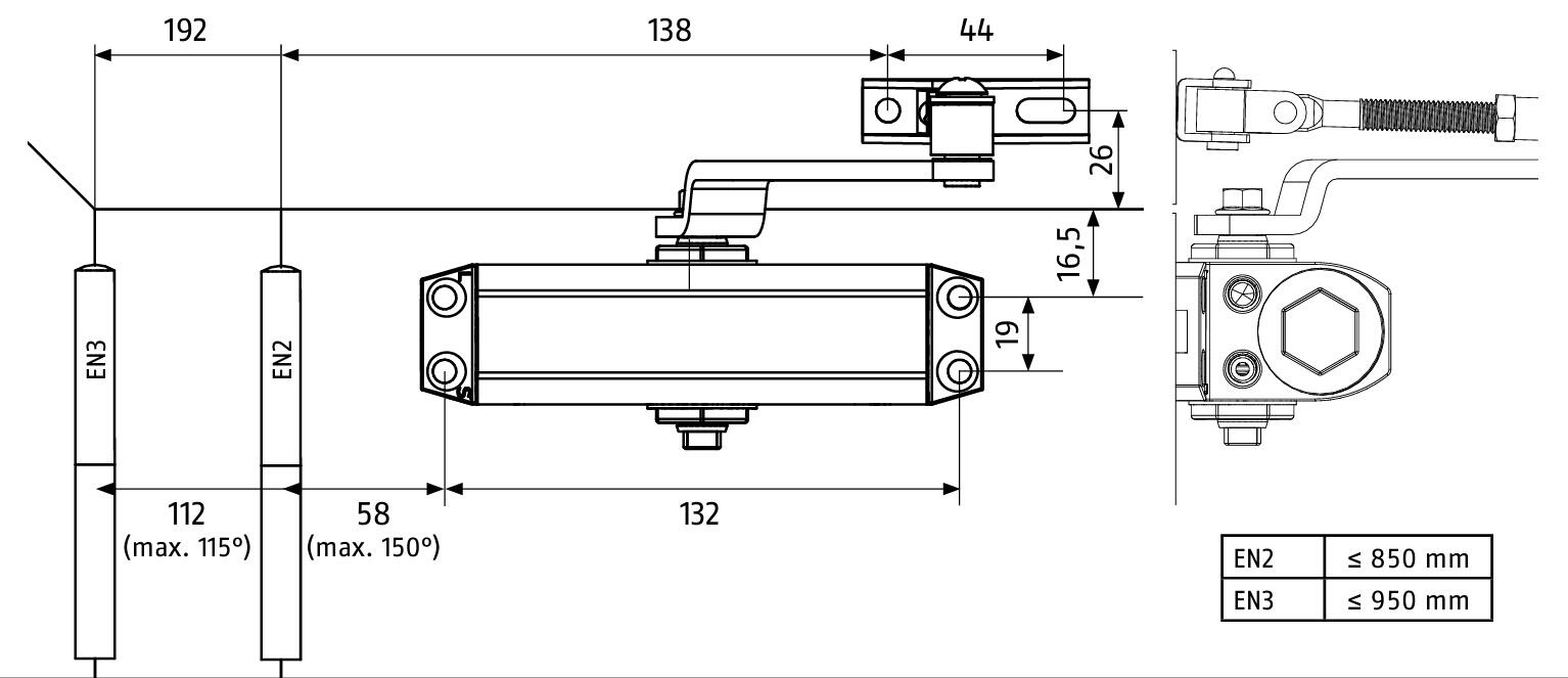 Lukkekraft EN 2, 3 Maks. vægt på dørblad: 45 - 65 kg. Maks. bredde på dørblad: 850 - 950 mm. Justerbar lukkehastighed.