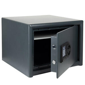 Værdiskab med dobbeltvægget kabinet og dør. Fås med nøgle og elektronisk kodelås .