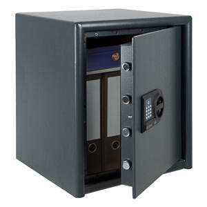 Værdiskab med dobbeltvægget kabinet og dør. Fås med nøgle og elektronisk kodelås.