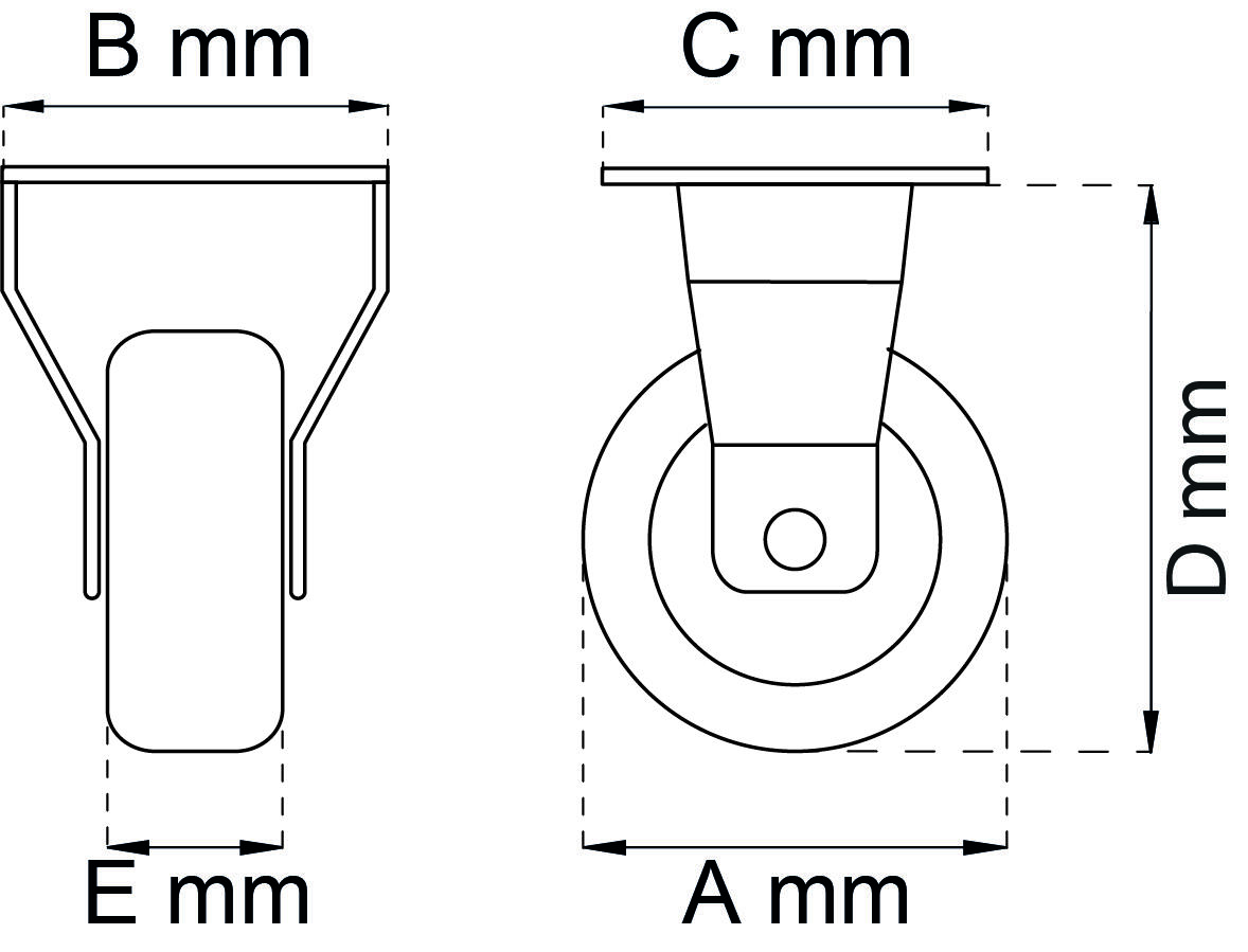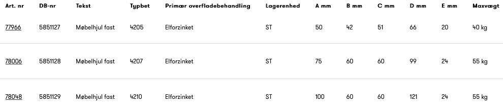 Møbelhjul fast med plade 60x60 mm. Grå. Ø75 mm. Maksbelastning 55kg. (Beregnet værdi - garanteres ikke).
