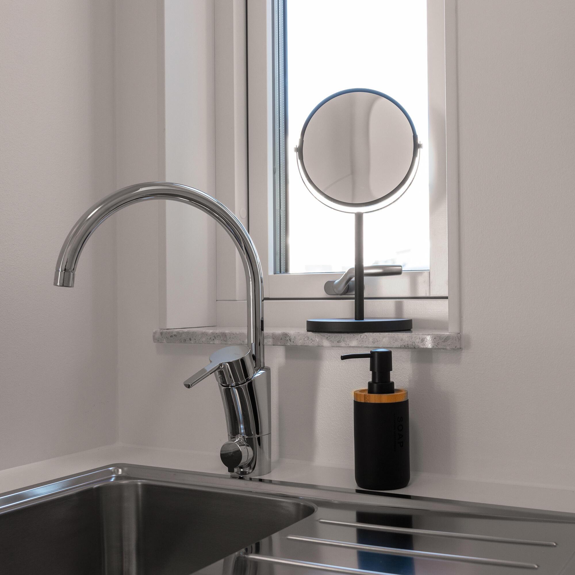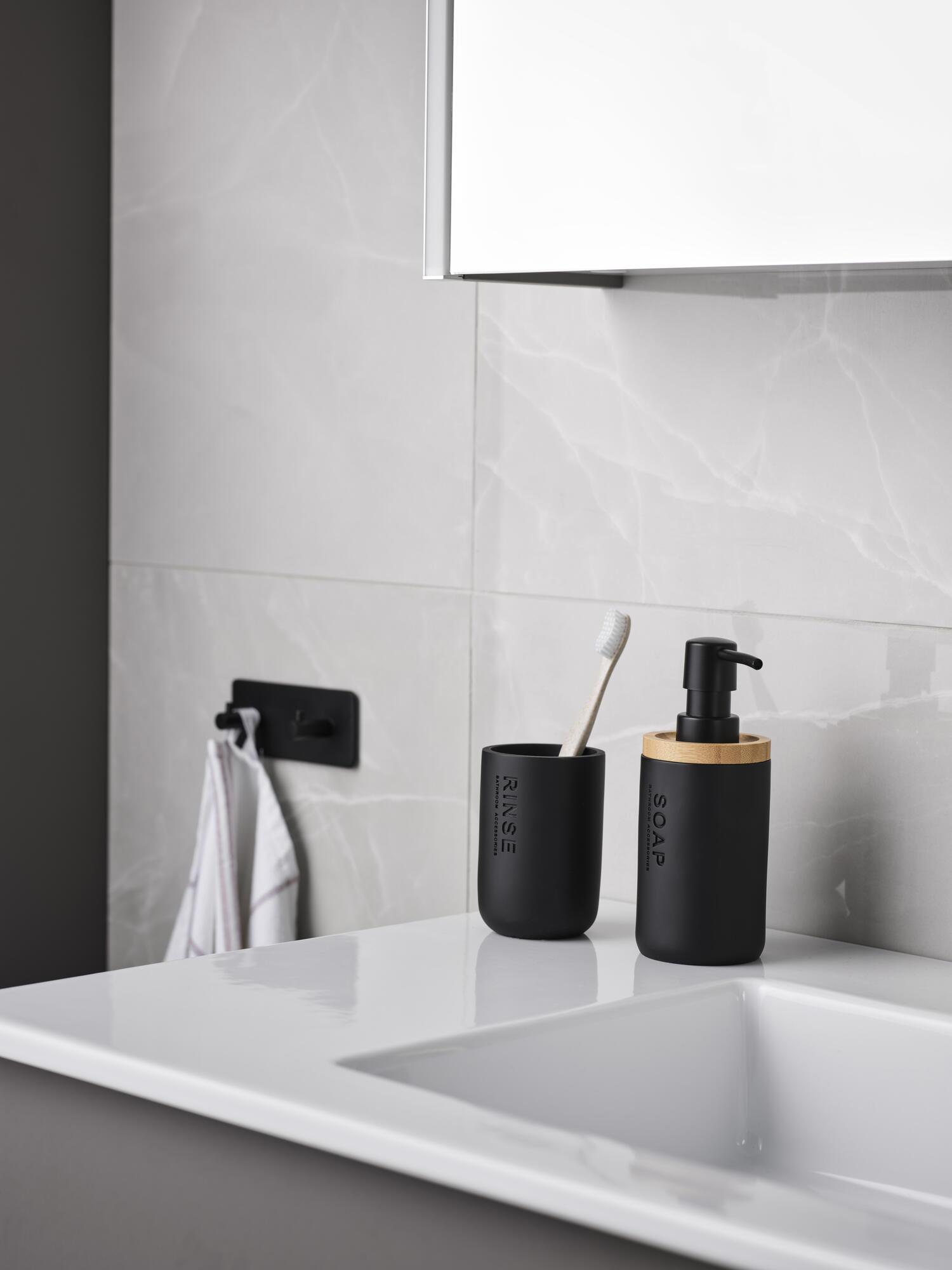 Moderne og stilfuld sæbedispenser fremstillet af polyresin og bambus. En flot indretningsdetalje på badeværelset. Diameter 65 mm. Højde 160 mm.