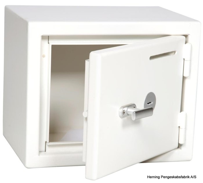 Das Gehäuse besteht aus 4 mm Stahlblech mit zusätzlicher Sicherung der lebenswichtigen Teile, u.a. Bohrschutz in Manganstahl, Explosionsschutz, Scharniersicherung durch Hinternaht. Der "Briefschlitz" ist natürlich mit einer Fischsicherung gesichert.