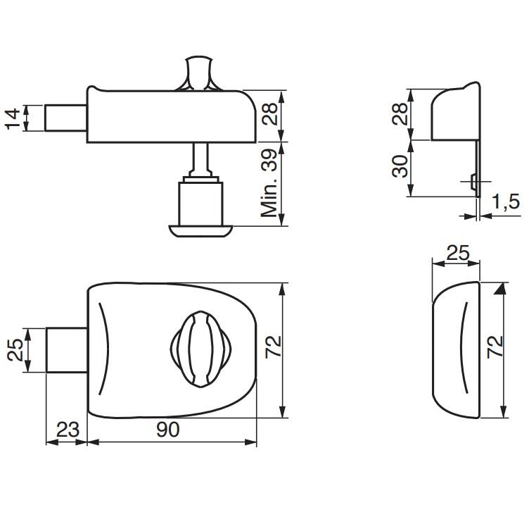 Der Zylinder ist in glänzendem Chrom erhältlich. Kastenschloss und Endplatte aus schwarz lackiertem Stahlblech, Riegel aus glänzend vernickeltem Messing.