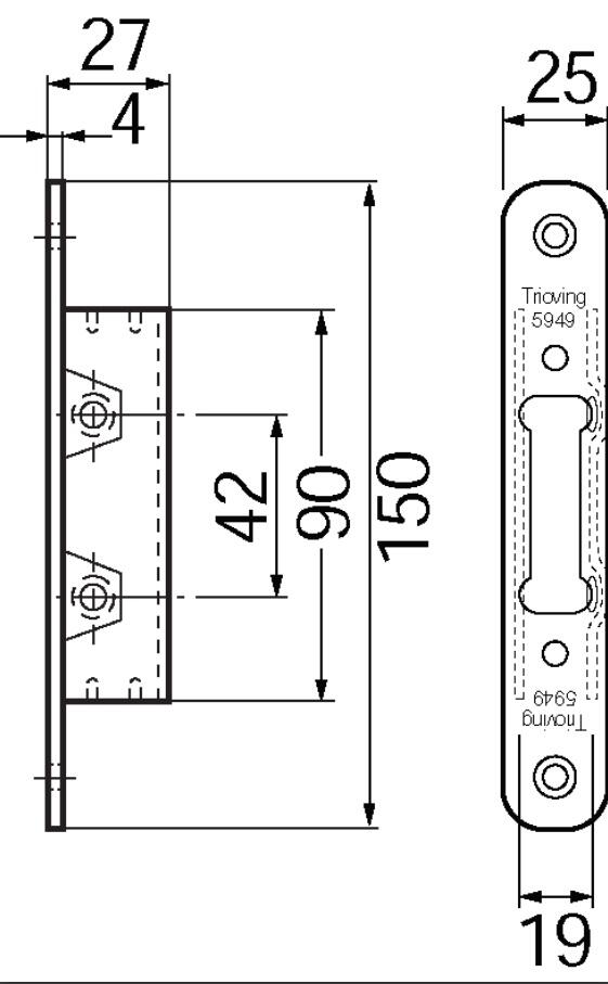 Produkteigenschaften Sicherheitsendplatte für TrioVing Schmalprofilschloss 5049. Neben normalen Schrauben ist die Endplatte zusätzlich mit zwei Schrägschrauben verstärkt. Technische Spezifikationen Verchromter Stahl.
