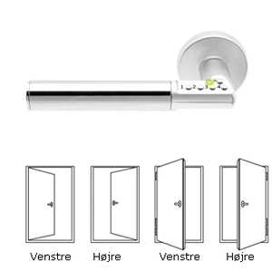 Låsbart dørgreb med 5 knapper. 4 knapper til at indtaste den 4 til 6 cifrede brugerkode, samt 1 knap til låsning. Administrationskode og brugerkoder programmeres ved installation. Administrations- og bruger koder kan ændres efter behov. Unik reset funktion indbygget. Blokeringsfunktion ved forkert indtastet kode (3 gange) indbygget. Kan altid åbnes fra indvendig side, men den udvendige side er frikoblet indtil korrekt brugerkode indtastes. Når batterierne er ved at være brugt, blinker den røde diode hver gang der trykkes på en knap. Administrationskode og brugerkoder huskes under batteriskifte.