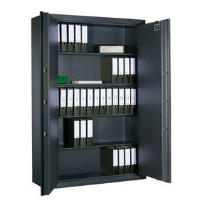Godkendt til opbevaring af kr. 40.000,00 u/alarm og kr. 80.000,00 m/alarm. Inkl. 4 hylder. Plads til 70 ringbind.