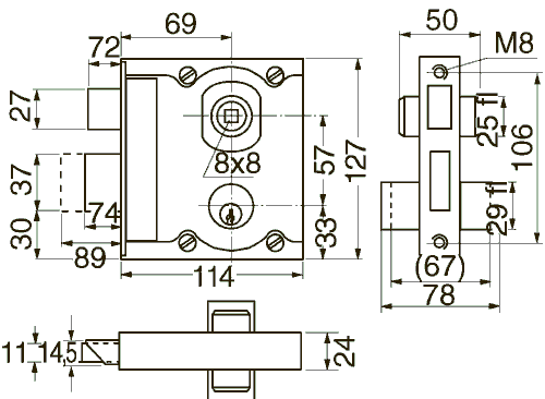 Fall and bolt lock with cylinder on both sides. The bolt has 2 turns. Fall and bolt are elongated. Intended for pipe frames. The catch and bolt must be adjusted when mounting on the grid door. Lock case and bolt of yellow chromated steel. Fall of brass