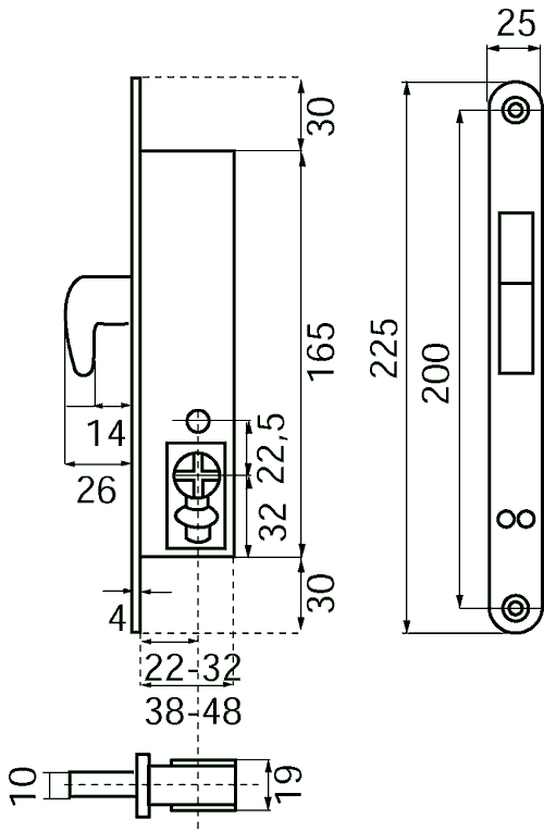 Exterior doors or sliding doors with narrow aluminum, plastic or steel frame. Can be used in combination with door closer and door handle. The lock can also be used as an extra lock.