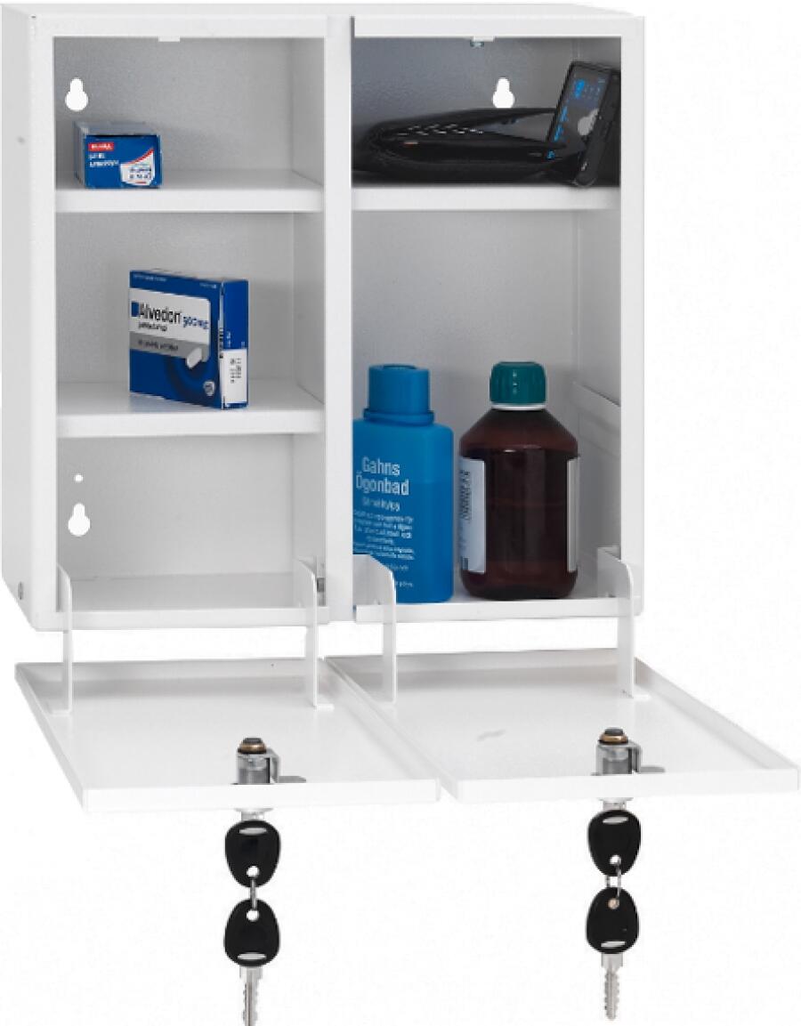 Let at placere og håndterbare medicinskabe, der er meget populære inden for sundhed og pleje. Skabene giver en vis tyverisikring og holder uvedkommende væk. Medicinskabene er forberedt til boltning i bunden og hængende på væggen. Skabene Alicia, Louise og Matilda leveres med cylinderlåse, men fås med elektriske kodelåse. Karin har som standard en elektrisk kodelås.