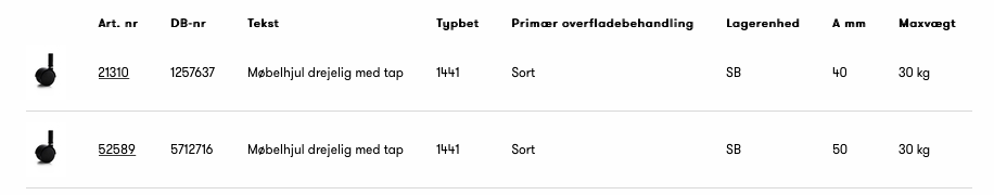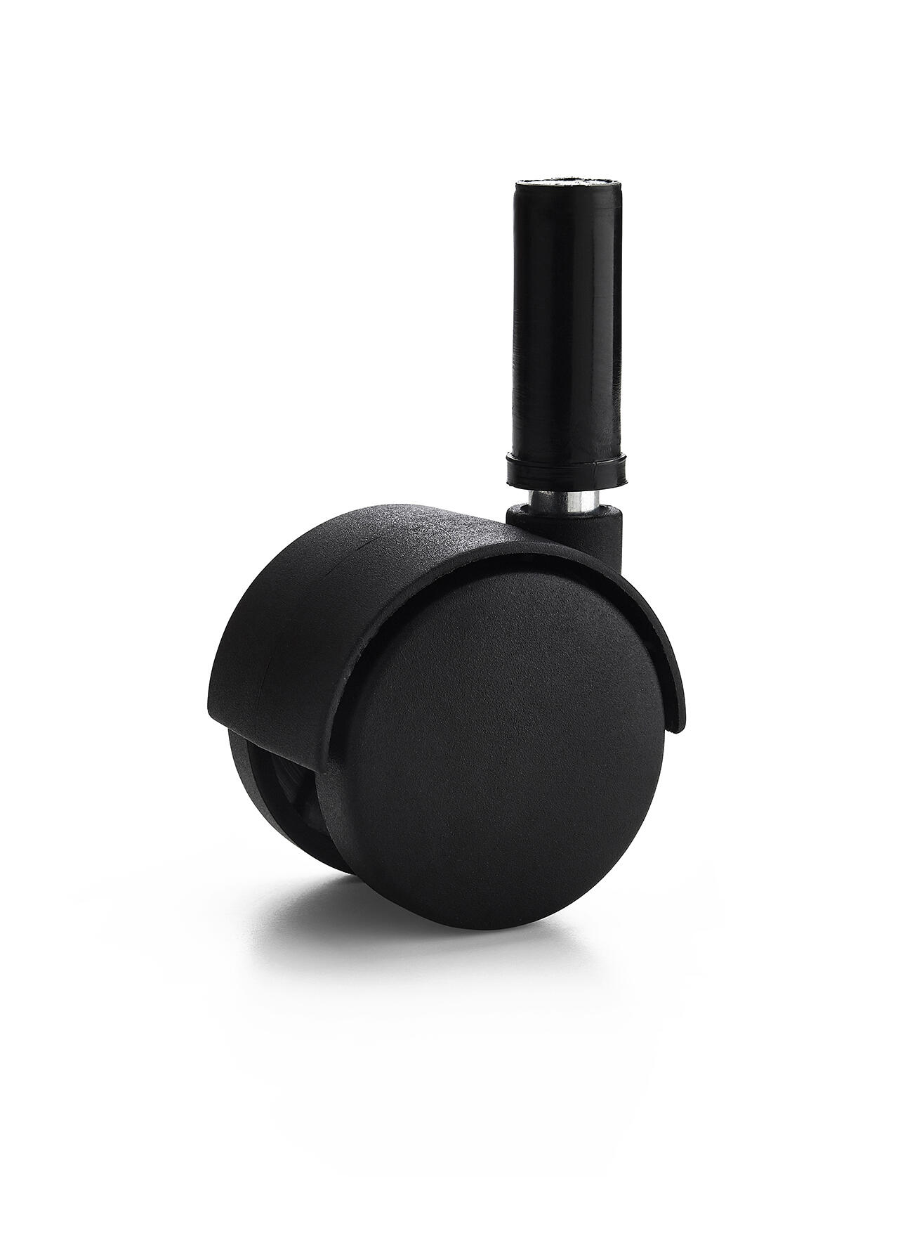 Møbelhjul drejelig med tap af stål. Hjul af sort nylon. 50 mm. Maxbelastning 30 kg. De angivne værdier for anbefalet maxbelastning er anslåede og garanteres ikke.