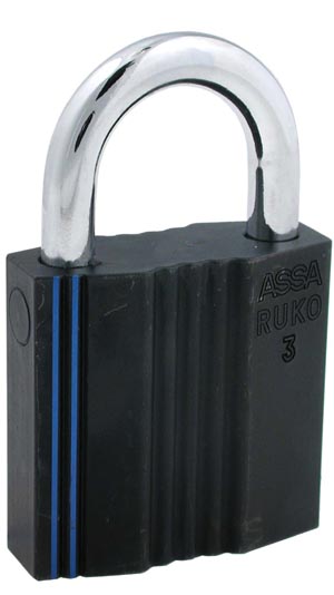 Tvunget låselås med 10 mm herdet stålbrakett i blank krom. Jakke i herdet stål, svart krom med blå fargemerking.