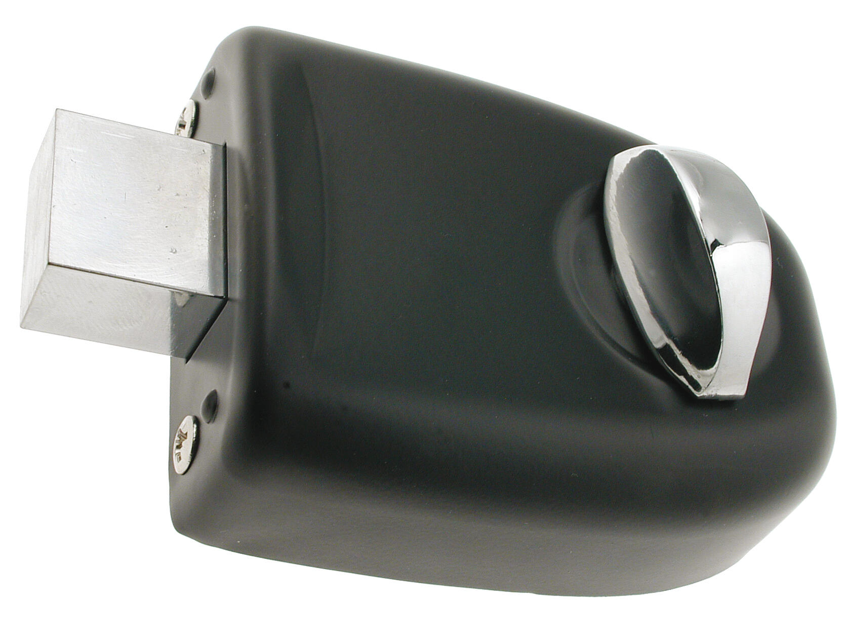 Sidehengende dører eller vippedører for låsing i forbindelse med montering av hvilebeslag. Trekk låsen inn i låsekassen med en knapp eller skiftenøkkel.