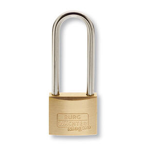 Cylinder hængelås med massivt messinghus og rustfri høj bøjle. Dobbelt låsning (fra str. 30mm). Rustfri inderværk
