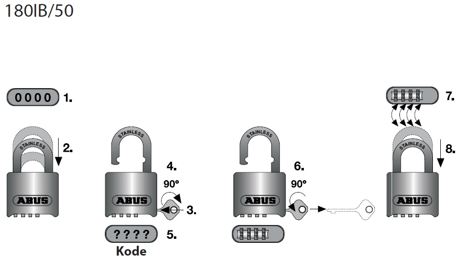 Kodelås i messing med 4-sifret justerbar kode. Hengeren og de indre komponentene er laget av rustfritt materiale. Spesielt egnet for maritim bruk.