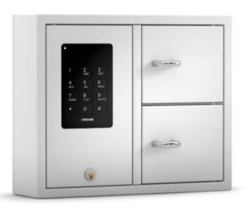 Brugervenligt og praktisk nøgleskab med 2 låger, 8 nøglekroge i hver dør og enkelt login med brugerkode. Koder programmeres via enkle kommandoer med tastaturet.