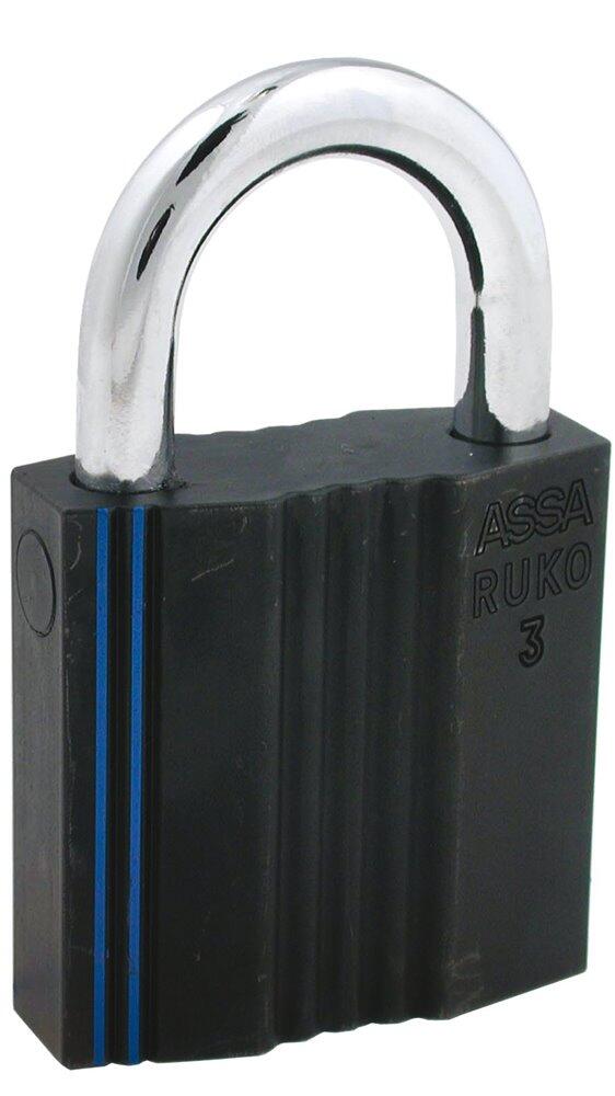 Tvangslukkende lås med 10 mm hærdet stålbøjle i blank krom. Kappe af hærdet stål, sort krom med blå farvemarkering.