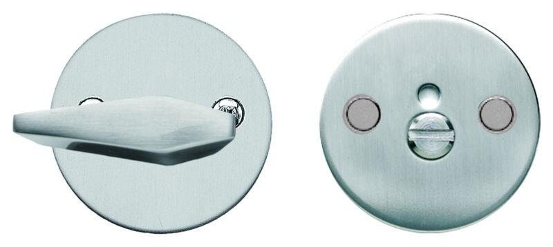 Toiletbesætning med massiv roset. ø50x2 mm. Matbørstet rustfrit stål (AISI 304 ) Med løse bøsninger og synlige skruer. Leveres i sæt inkl. M4x84 mm. skruer. Til dørtykkelse 34-50 mm.
