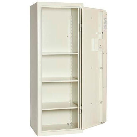 Profsafe værdiskab S1600 m. 3 hylder m/el-kodelås S1600 skab til gulvmontage. Findes med el-kodelås eller nøgle. Godkendelse SS3492 er accepteret af Forsikring og Pension (F&P). Leveres som standard med 3 hylder. Flere hylder kan leveres på bestilling. Se varenummer 1648508397 Udvendige mål 1500x575x500 mm (HxBxD) Indvendige mål 1492x547x430 mm (HxBxD) Vægt 169 kg. Volumen: 388 L Farven er RAL 9002