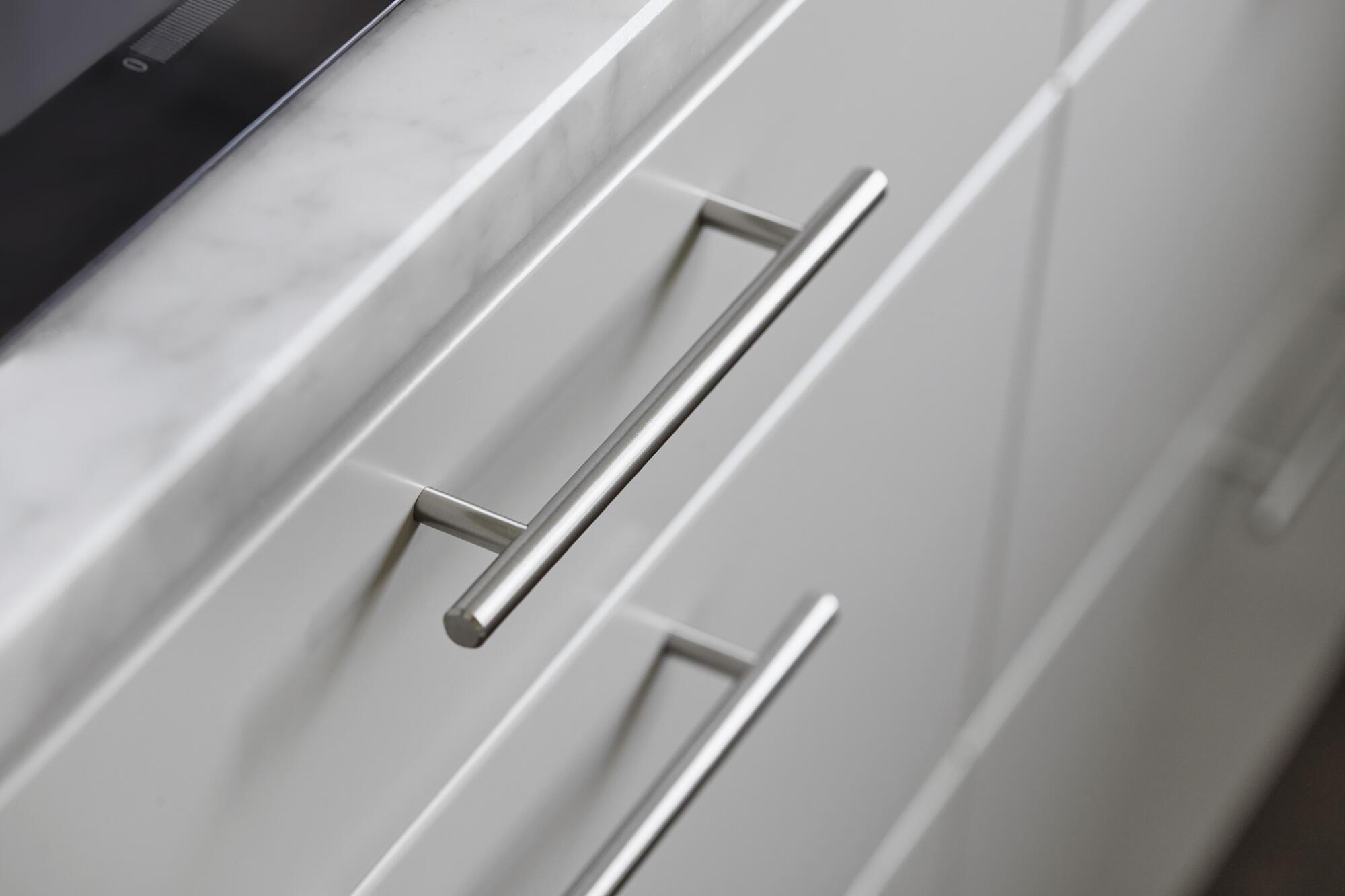 Møbelgreb i børstet stål. Længde: 160 mm. Højde: 35 mm. Ø: 10 mm. Centermål: 96 mm. Skruer medfølger. Leveres i en 2 styks forpakning. Moderne greb til låger og skuffer.