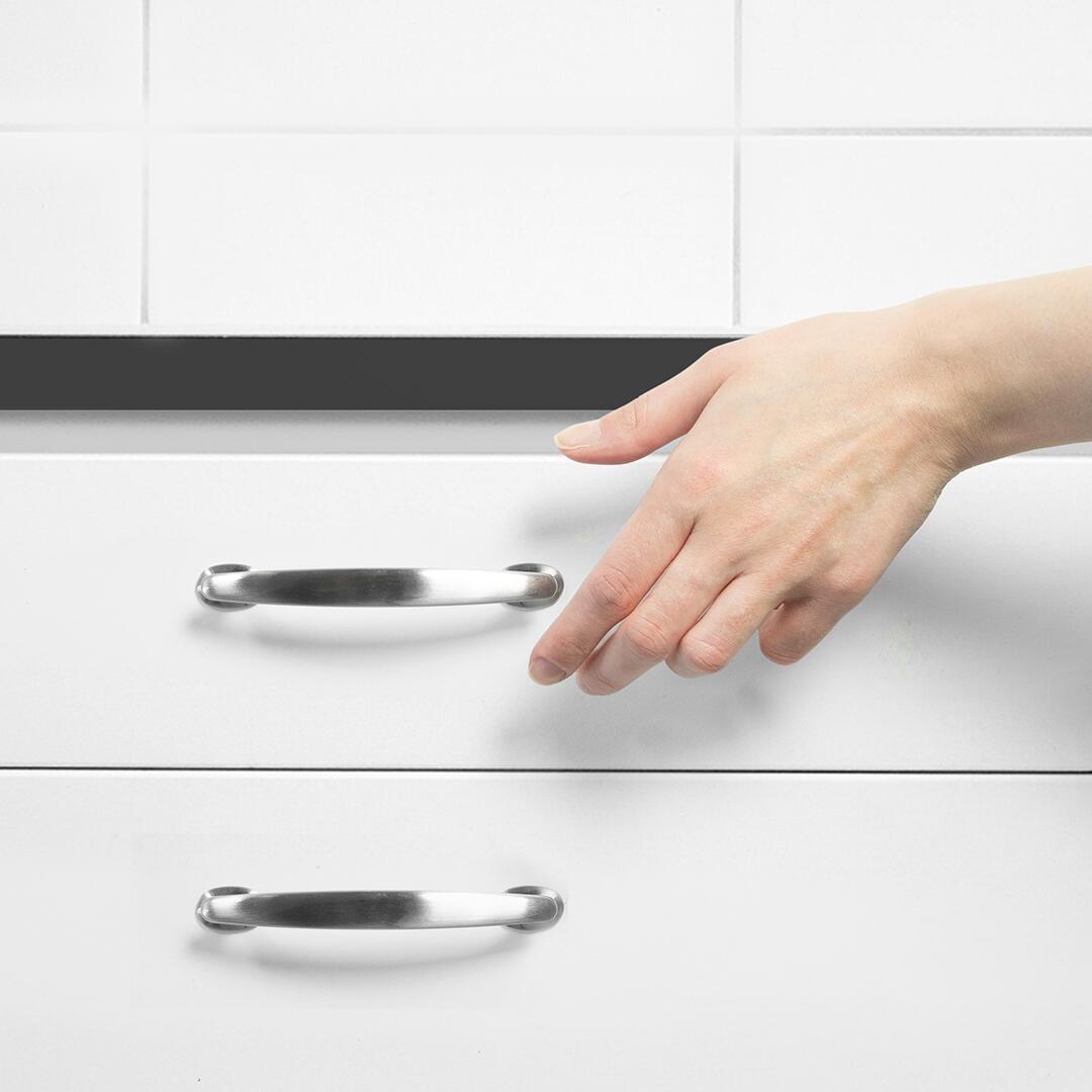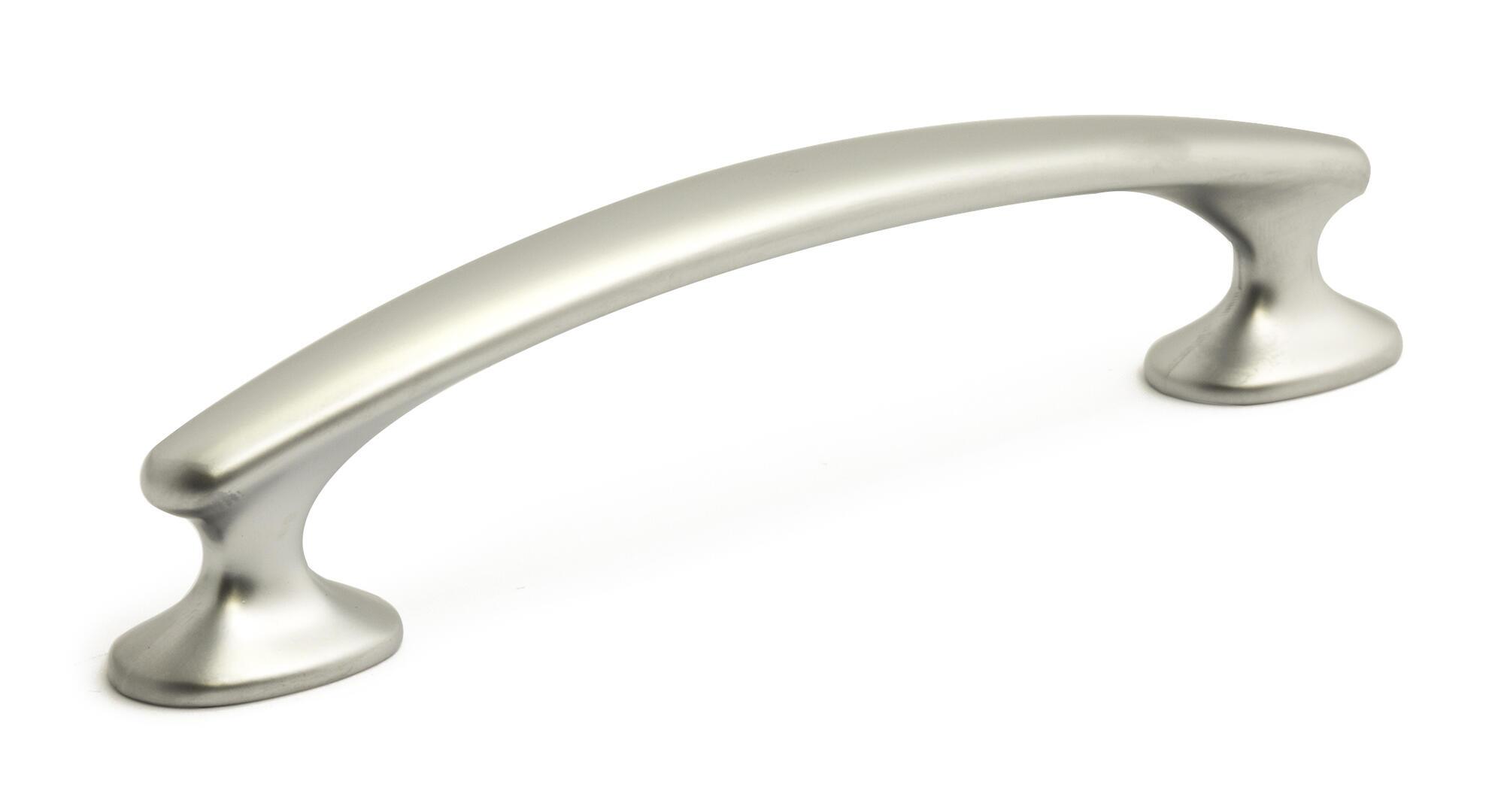 Møbelgreb i rustfrit stål med børstet krom finish. Længde: 155 mm. Højde: 30 mm. Centermål: 128 mm. Skruer medfølger. Leveres i en 2 styks forpakning. Et svagt buet greb med bløde linjer til låger og skuffer.