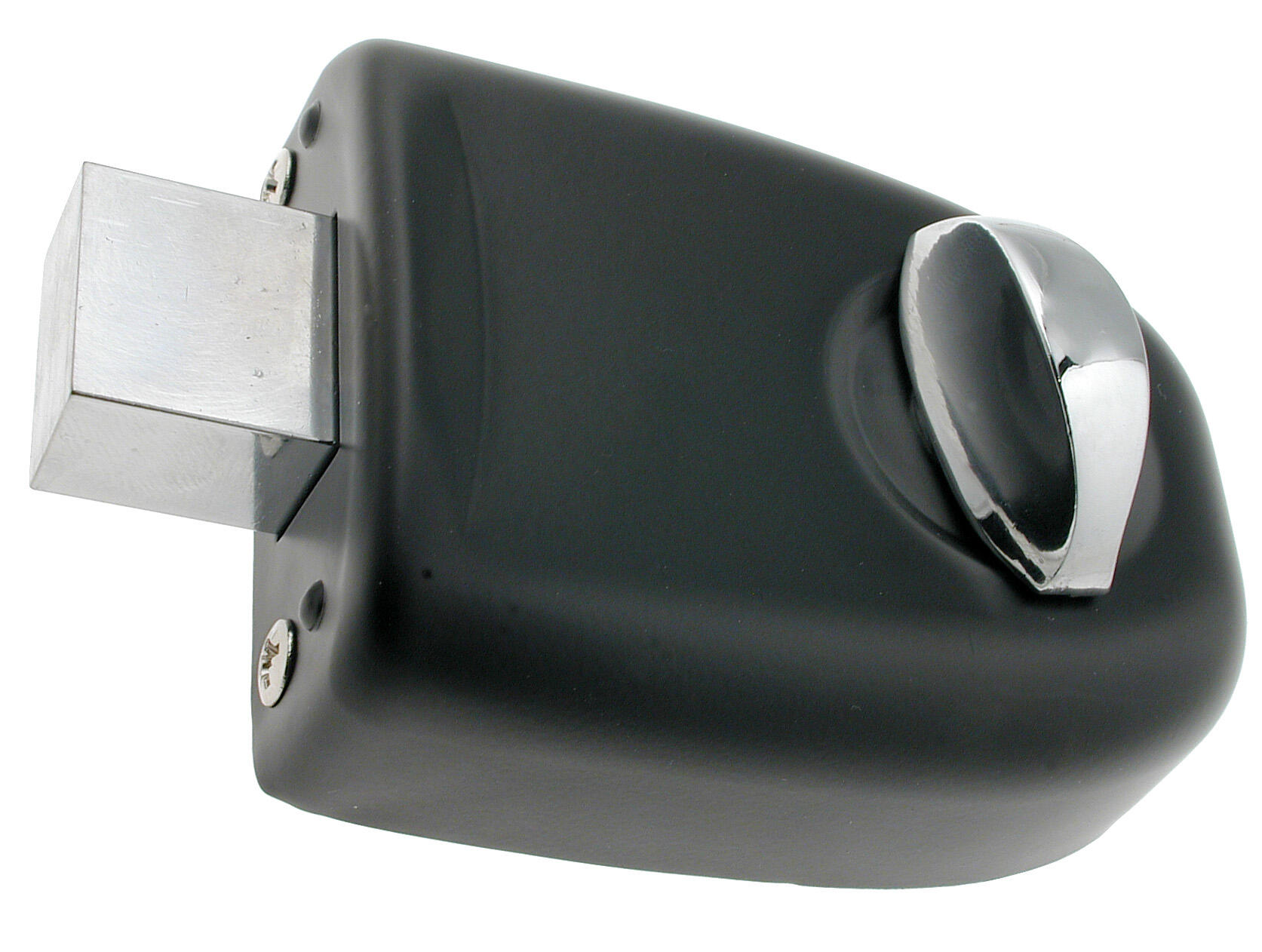 Glanset nikkelbelagt messingbolt. Låsekasse og endeplate av svartlakkert stålplate. Låsen leveres som standard for innadvendte dører.