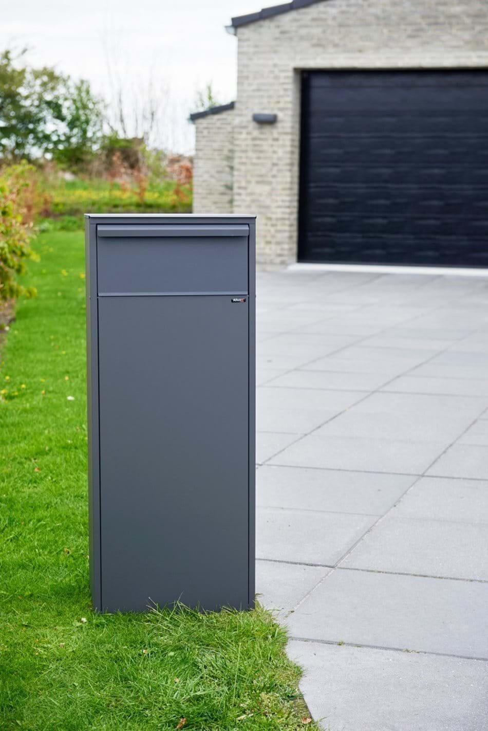 Pakkepostkasse, galvaniseret eller pulverlakeret galvaniseret stål. Monteret med Ruko lås. Mål: HxBxD: 980 x 390 x 280 mm. Pakkebrevindkast 105 x 320 x 320 mm.