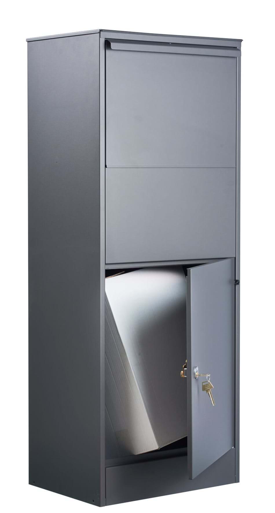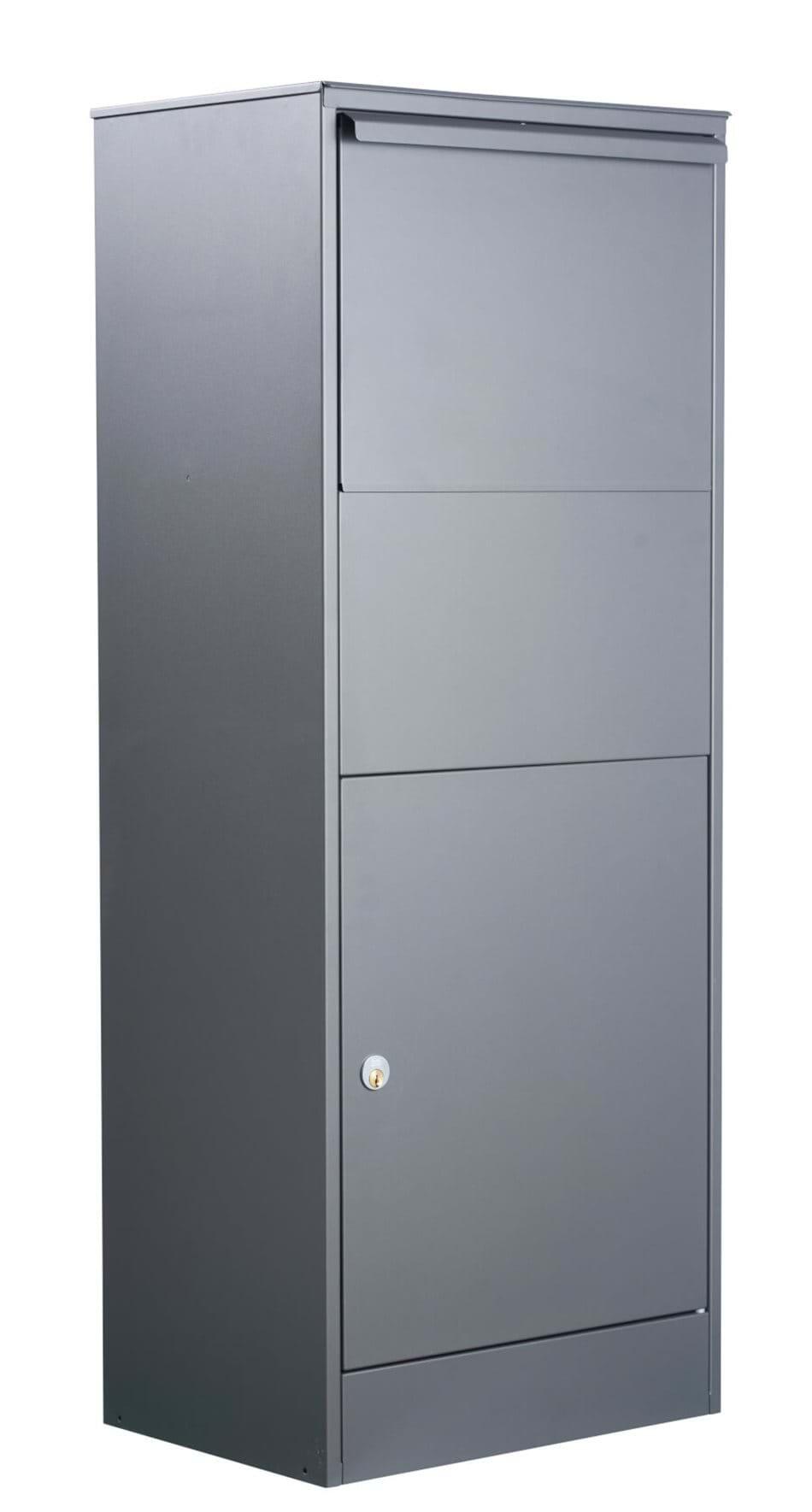 Ekstra stor Pakkepostkasse, pulverlakeret galvaniseret stål. Monteret med Ruko lås. Mål: HxBxD: 1150 x 450 x 320 mm. Pakkebrevindkast 160 x 390 x 450 mm.