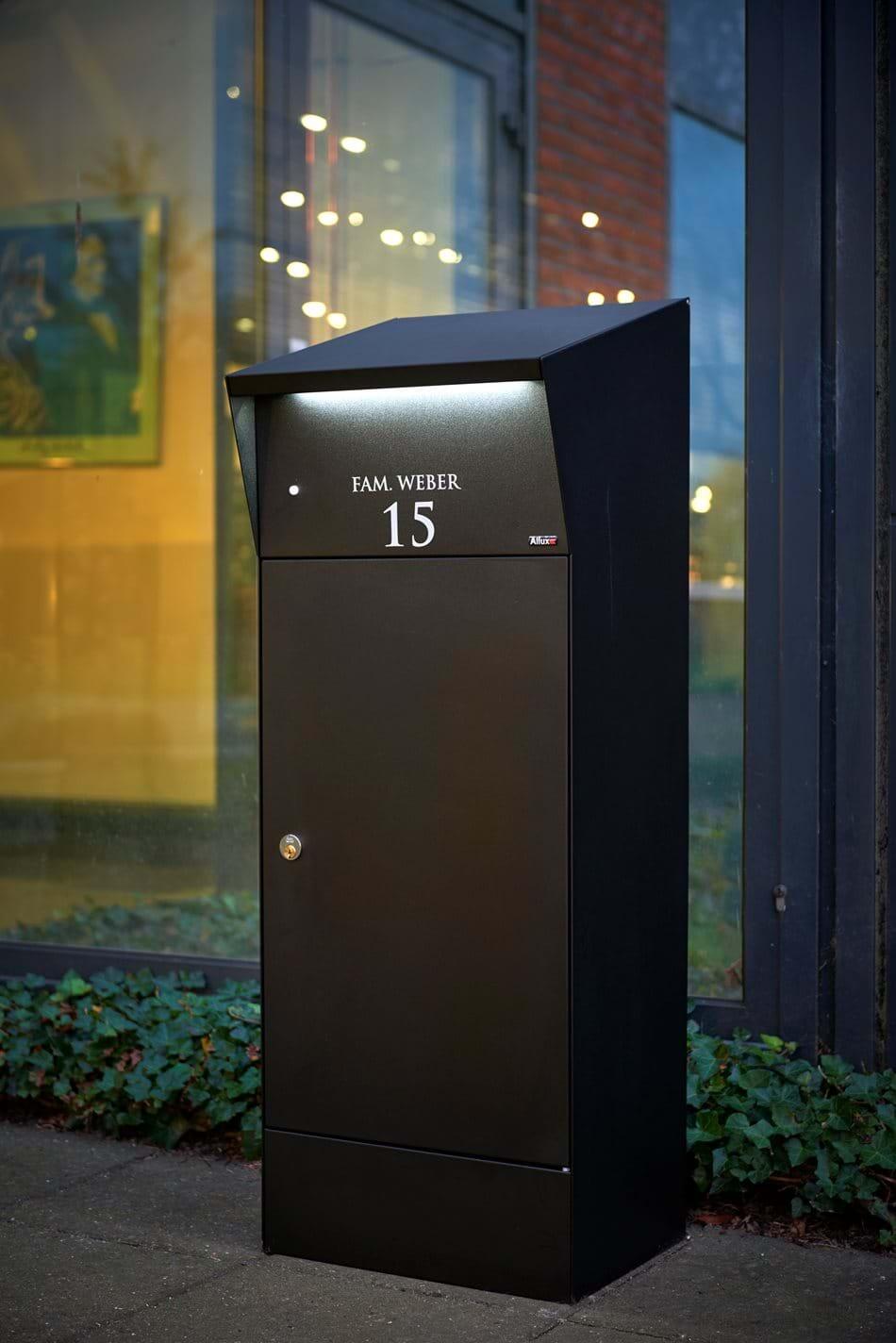 Pakkepostkasse med LED belysning, designet af Christian Bjørn. Fremstillet i kraftig pulverlakeret galv. stål med Ruko lås. LED lysindstilling af tid og skumring. Mål: HxBxD: 1100 x 400 x 365 mm. Pakkebrevindkast 155 x 350 x 300 mm.