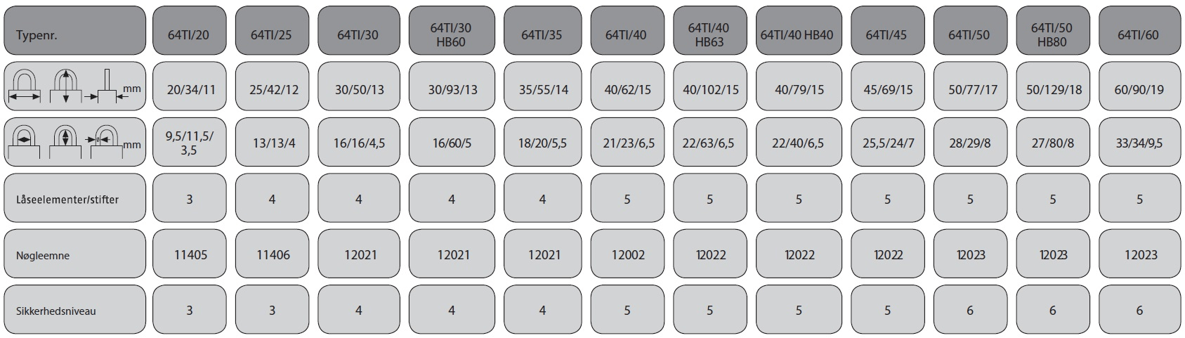 - 64TI/50HB60-150: Udtagelig bøjle, der kan justeres i størrelsen fra 60 mm - 150 mm