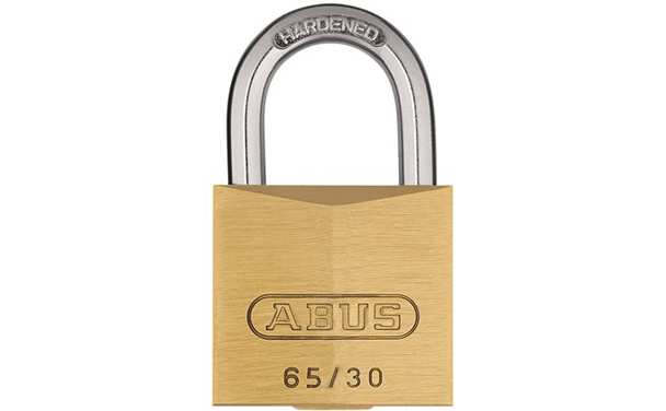Messing hængelås med hærdet stålbøjle. Begge sider af bøjlen aflåses.