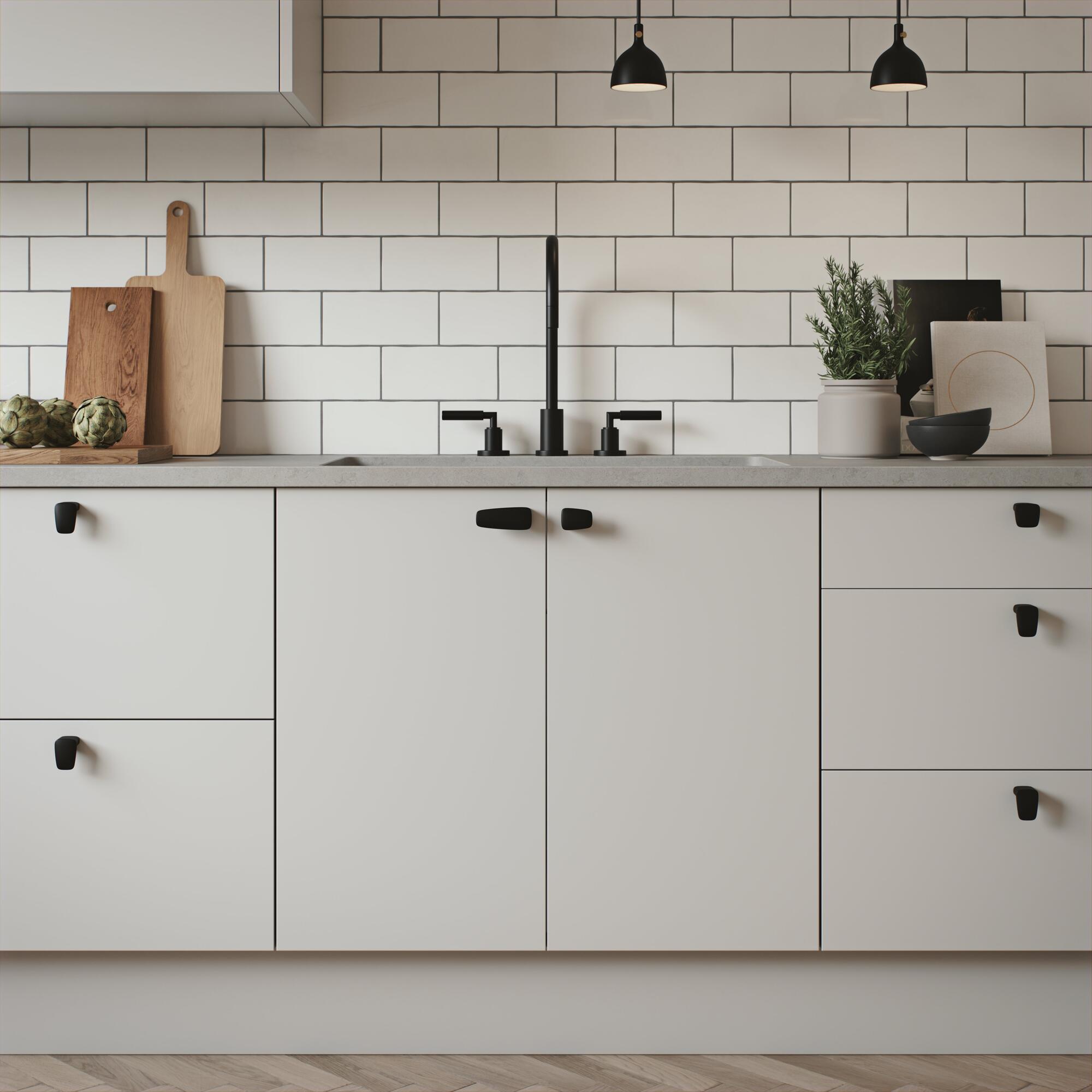 Designet møbelknop i genvundet messing, pulverlakeret matsort. Møbelknoppen fås i tre størrelser og kan hænges både lodret og vandret. Skab et legende miks med de tre modeller sammen, eller vælg en størrelse for et mere klassisk udseende. Formen og vægten emmer af eksklusivitet og tidløshed. Design: Monica Förster.