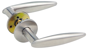 Uppsättning dörrhandtag i borstat stål inkl. rosetter för dörrtjocklek 32-65 mm.