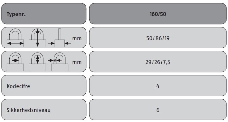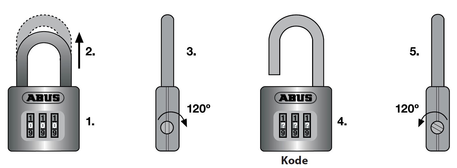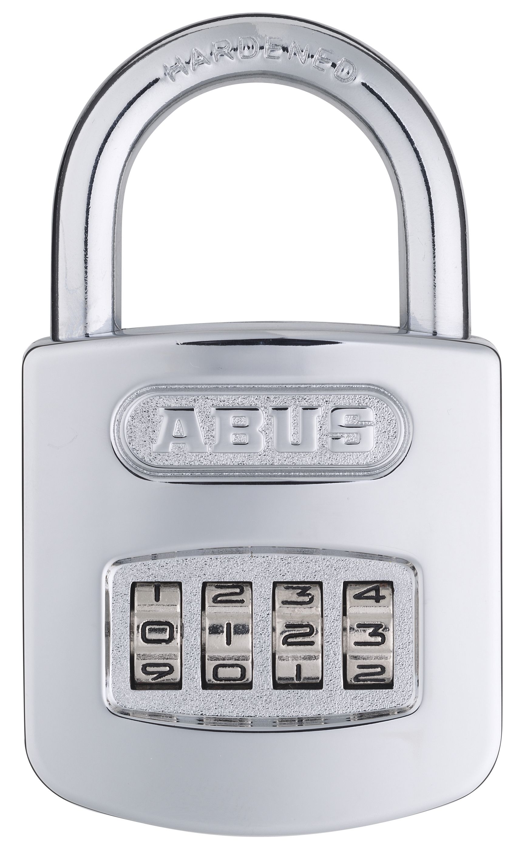 Kodlås med härdat stålfäste och fyrsiffrig justerbar kod. Ytan på lås och hängare är polerad krom.