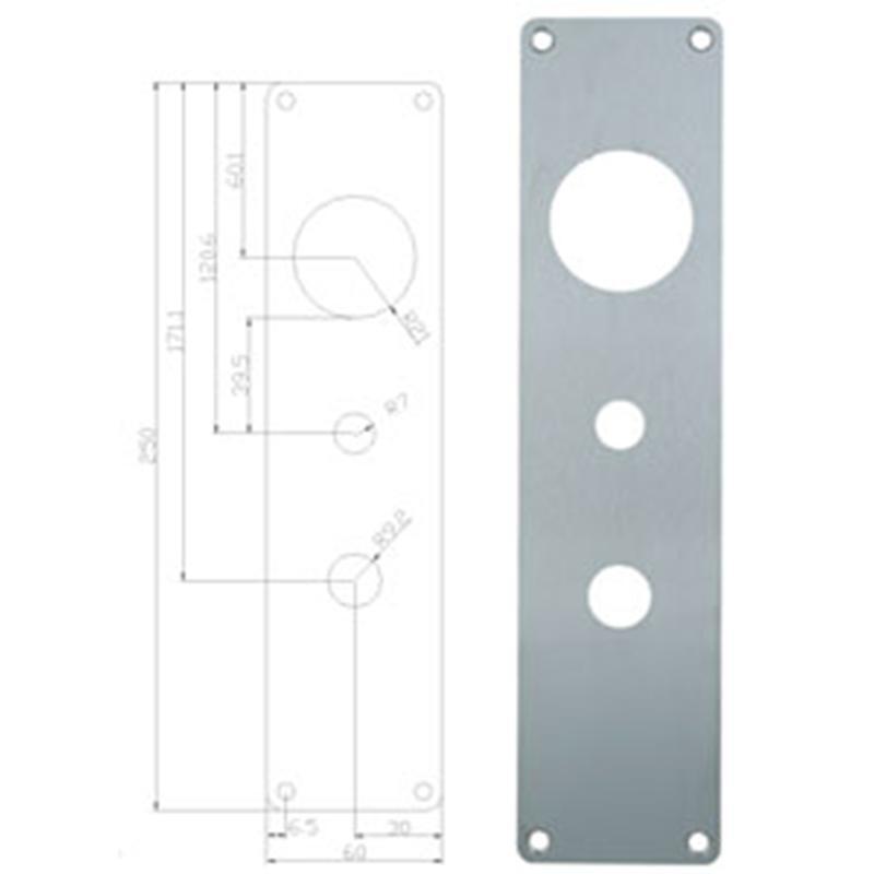 Langskilt i 2 mm. slebetrustfrit stål, med hul for cylinder og dørgreb samt vrider.
