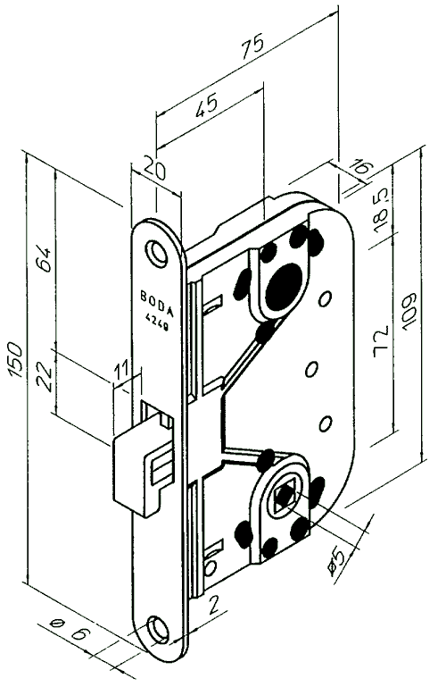 Svängbultlås med 11 mm bultprojektion på en gång, bulten styrs med våld med en nyckel eller toalettbesättning. Låset har ingen dörrhandtagsfunktion. Antal nyckelvarianter: 1 (Boda nyckel som för 414 lås).