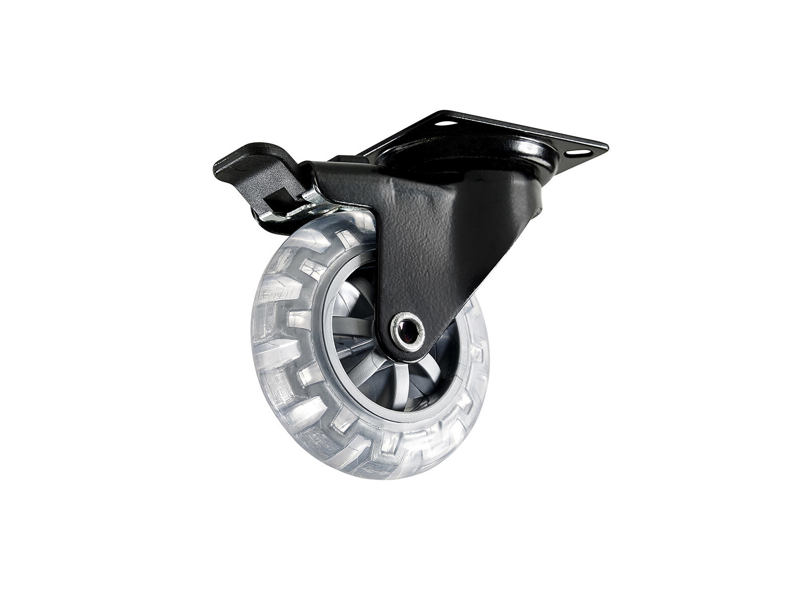 Møbelhjul drejeligt med bremse og plade af stål, 60x60 mm. Hjul af transparent PUR (Polyuretan). Ø50 mm. Maksbelastning 55 kg. (Beregnet værdi - garanteres ikke).