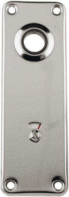 Exteriör lång skylt för lås på toalettdörrar. Lång skylt med hål för dörrhandtag och vit / röd markering ledig / upptagen. Monteras med 4 st. träskruv Ø3,5.