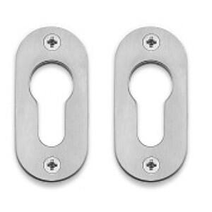 Oval roset, 65x30x3 mm, til smalprofildøre. Leveres som standard i matbørstet rustfrit stål (AISI 304) eller poleret messing. Huller for skruer, centerafstand 49. Leveres i sæt inkl. træskruer 4x16 mm. samt maskinskruer M4x16 mm.