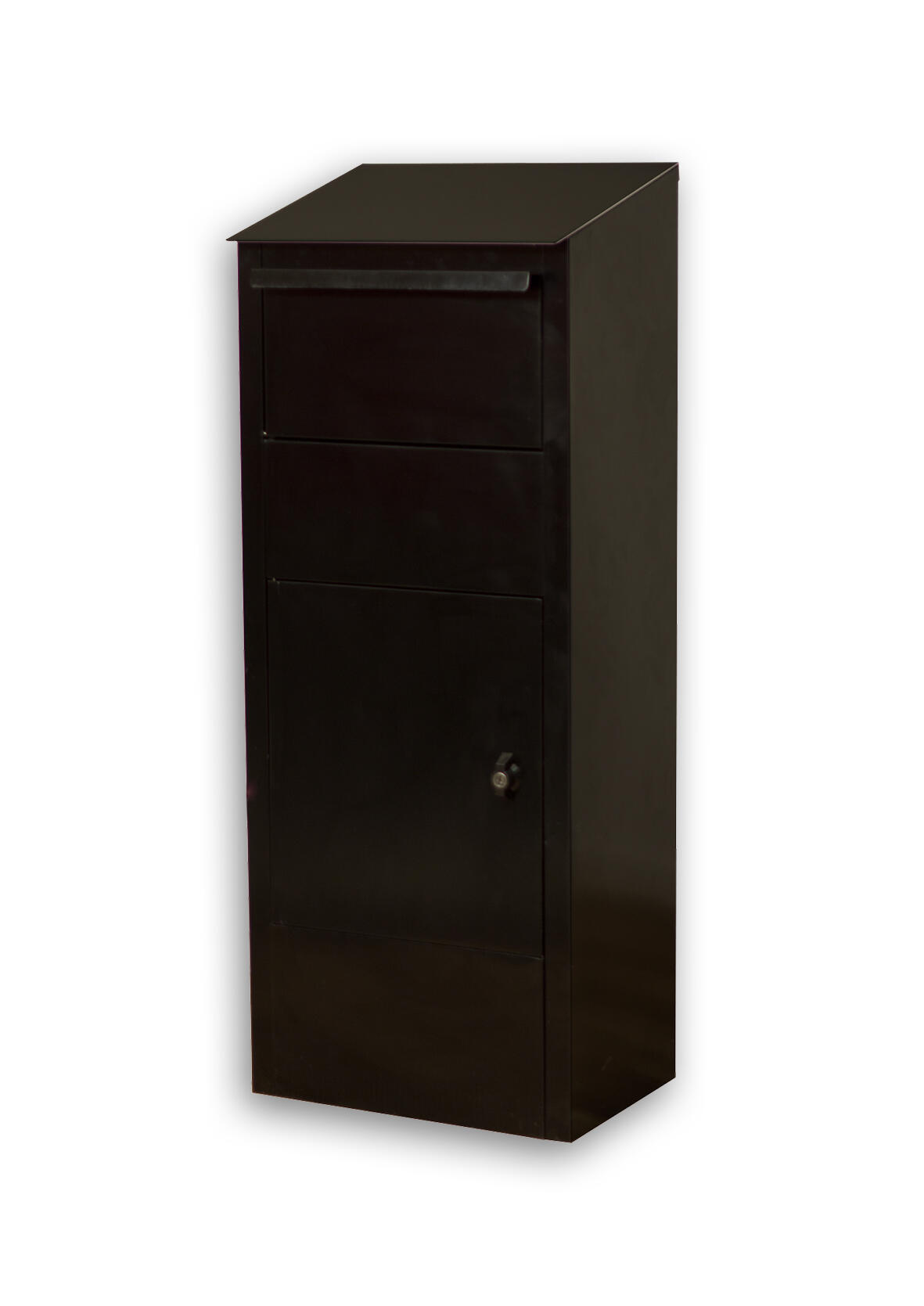 Låsbar postkasse af pulverlakeret galvaniseret stål. Rumlig og sikker postkasse for privatperson og virksomheder. Postkassen kan tag brev og pakker med mål optil 322x260x115mm. Den låsbar tømningslåge kan monteres foran eller bagpå. Leveres med 2 nøgler.