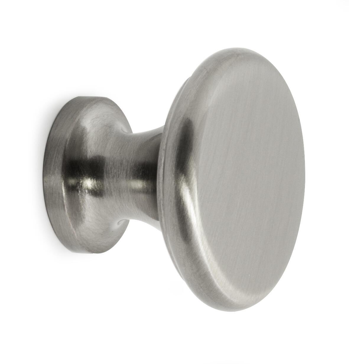 Møbelknop i zink/zamak med børstet nikkel finish. Ø: 38 mm. Fremspring: 22 mm. Skrue medfølger. Leveres i en 1 styks forpakning.