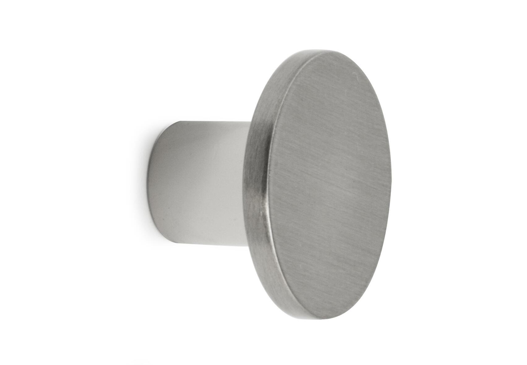 Møbelknop i zink/zamak med børstet nikkel finish. Ø: 28 mm. Fremspring: 18,5 mm. Skrue medfølger. Leveres i en 1 styks forpakning.
