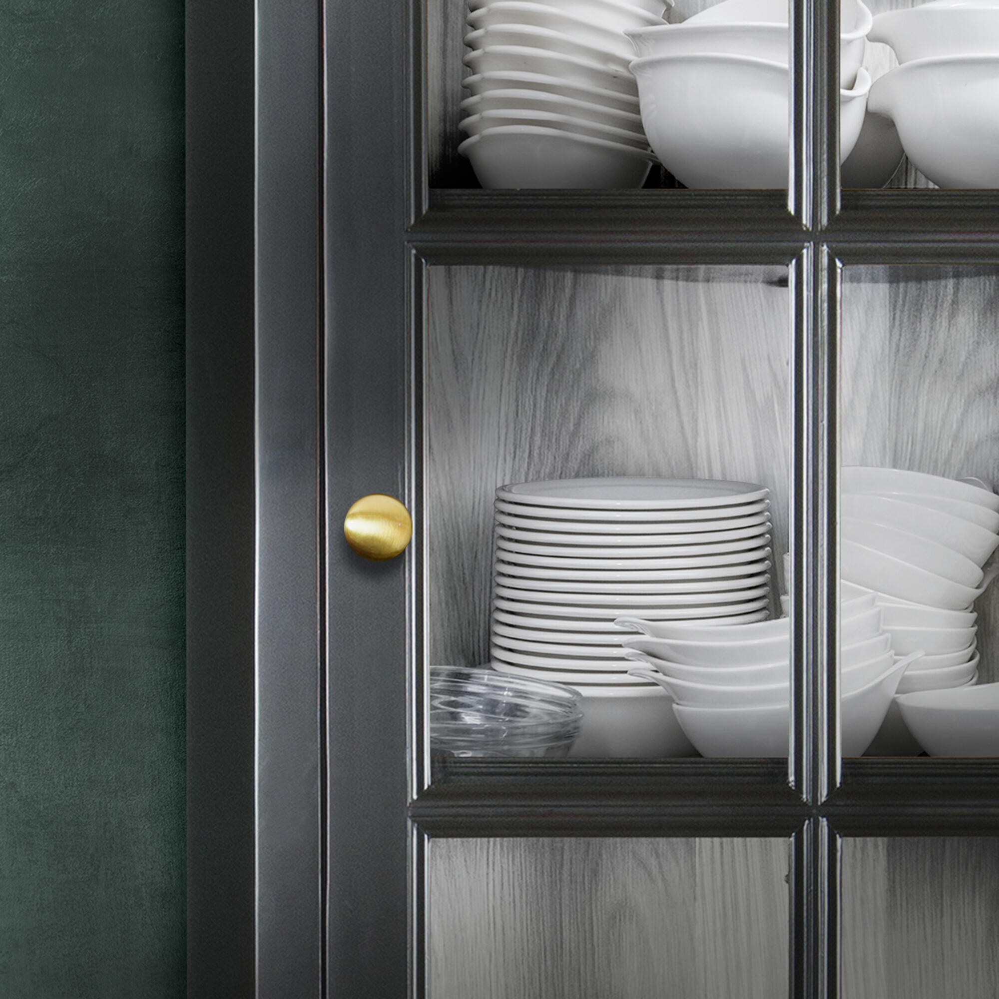 Møbelknop i zink/zamak med børstet messing finish. Ø: 32 mm. Fremspring: 29 mm. Skrue medfølger. Leveres i en 1 styks forpakning.