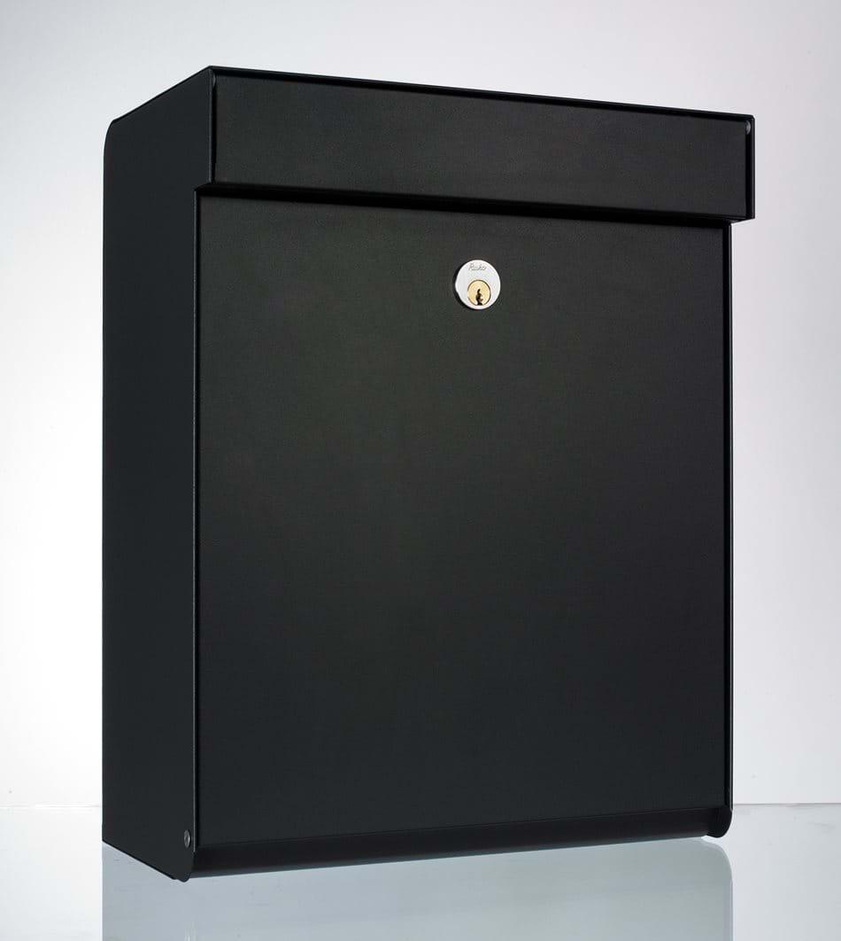 Spændende design, fremstillet i galvaniseret pulverlakeret stål, rustfrit stål eller kobber. Monteret med Ruko lås. Mål: HxBxD: 440 x 345 x 180 mm. Brevindkast 39x320mm. Brevindkast kan aflåses.
