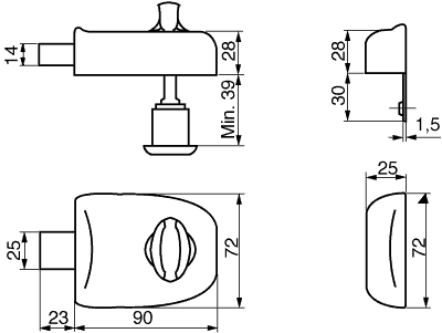 Bultlås med 23 mm bultutskott i ett varv. Bulten är utrustad med 2 lösa härdade stålstift som förhindrar sågning.