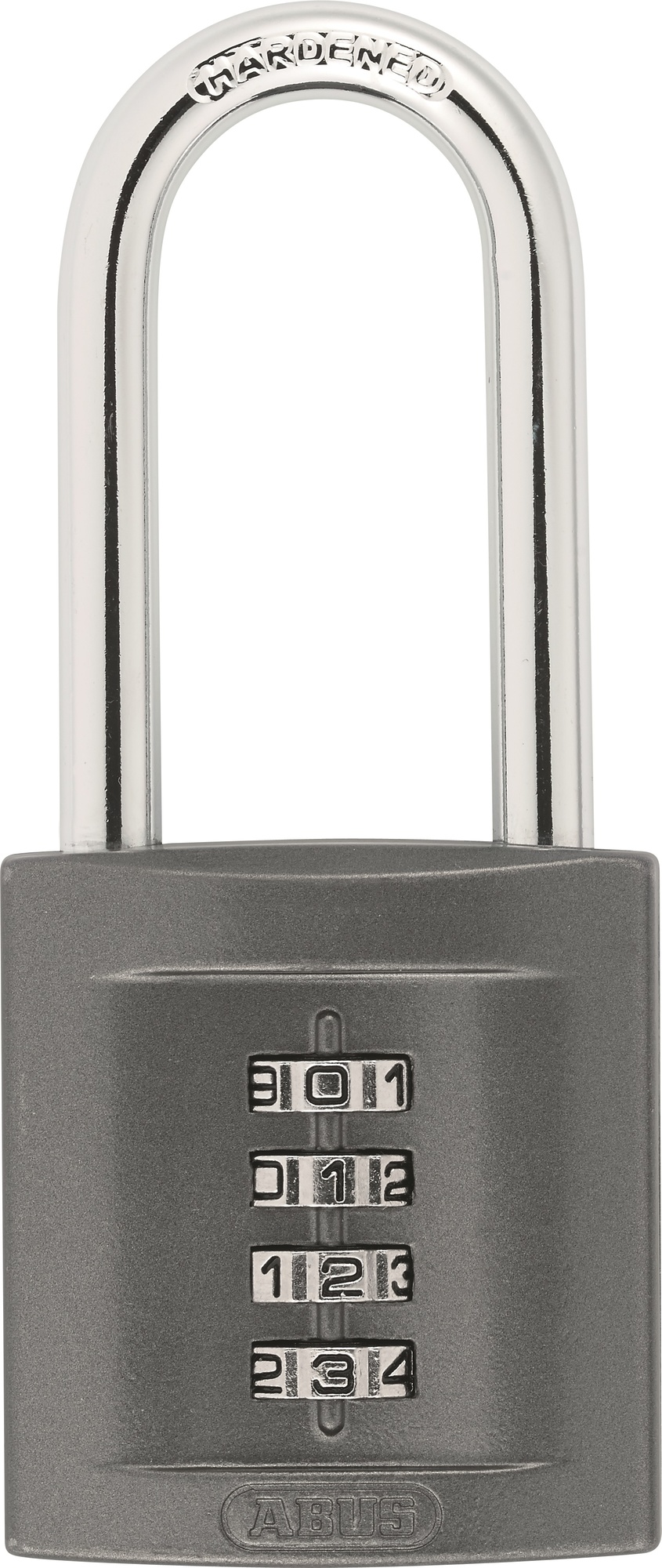 Hög hållare 50 mm. Hänglås med fyrsiffrig kod. Koden ställs in individuellt. ABUS säkerhetsnivå 5.