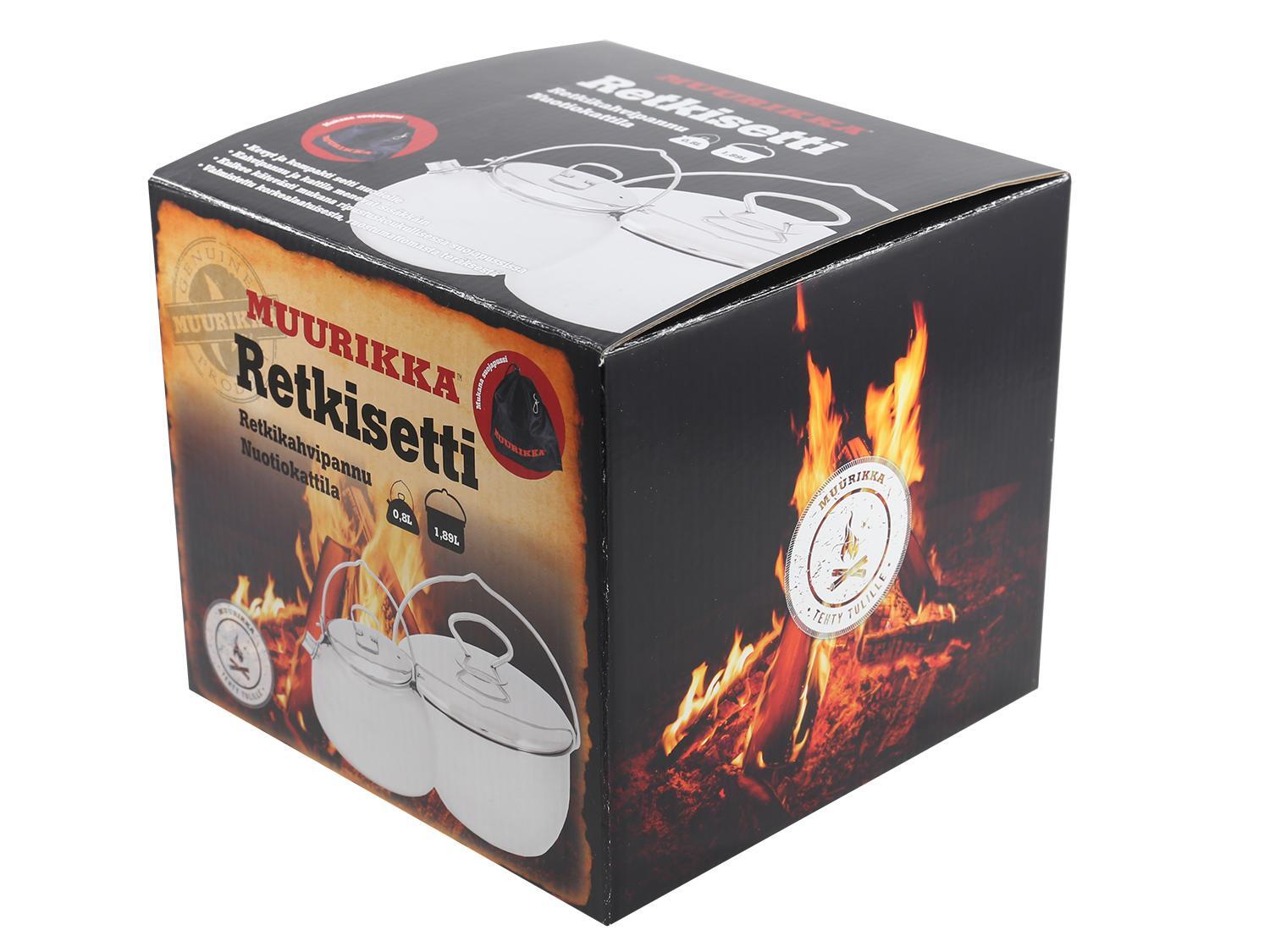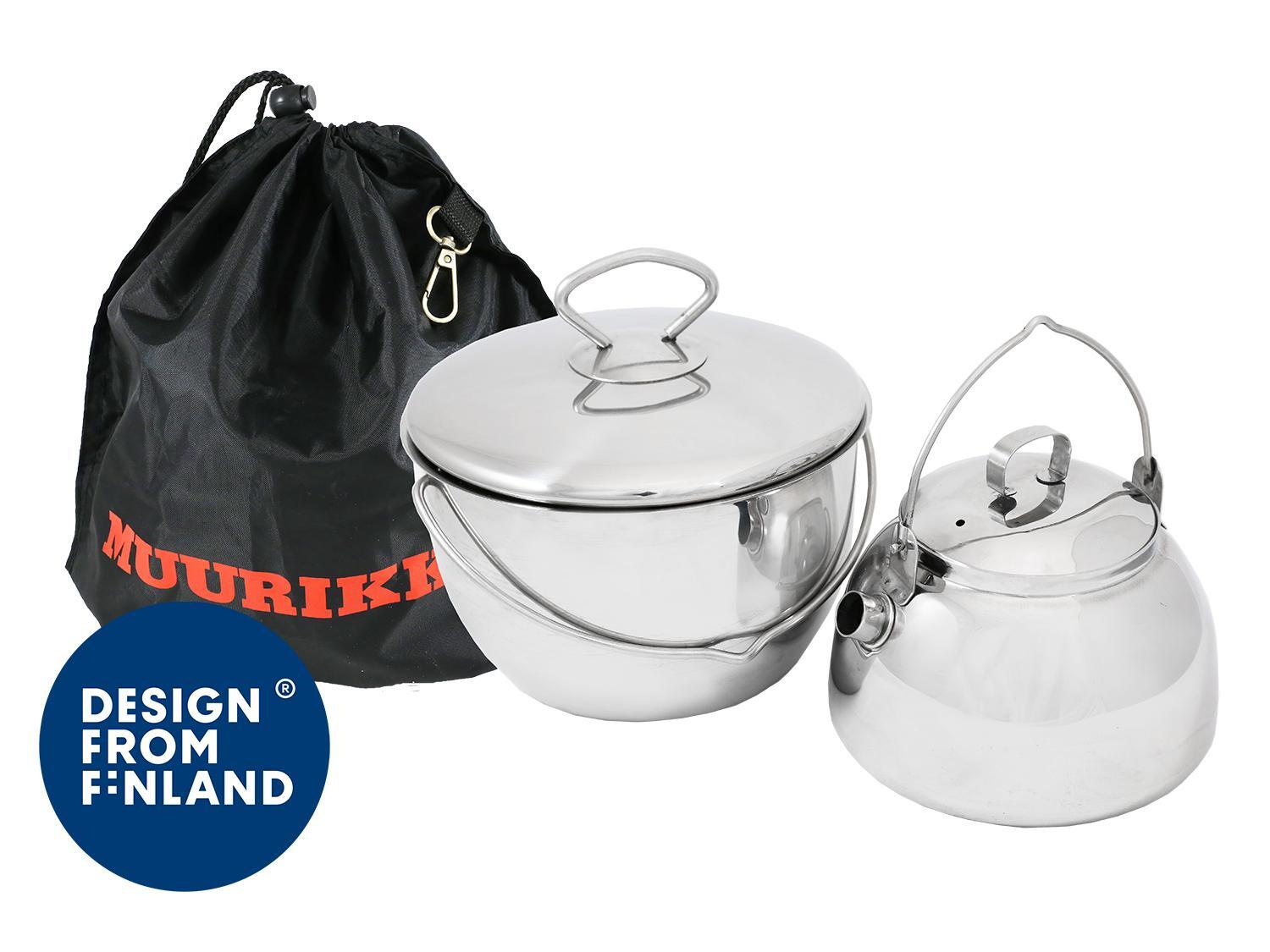 Kompakt letvægts bålsæt. Sættet indeholder den klassiske Muurikka Bålkedel 0,8 liter og gryde 1,89 liter. Sættet tager lidt plads - bålkedlen passer inde i gryden. Leveres med en beskyttende taske til bekvemt at bære sættet. Tasken har en løkke til fx at hænge den op i din rygsæk. Tasken beskytter også andet vandreudstyr mod sod. Kedlen og gryden er lavet af højkvalitets rustfrit stål, begge har hængende håndtag. Nem at hænge over bålet.