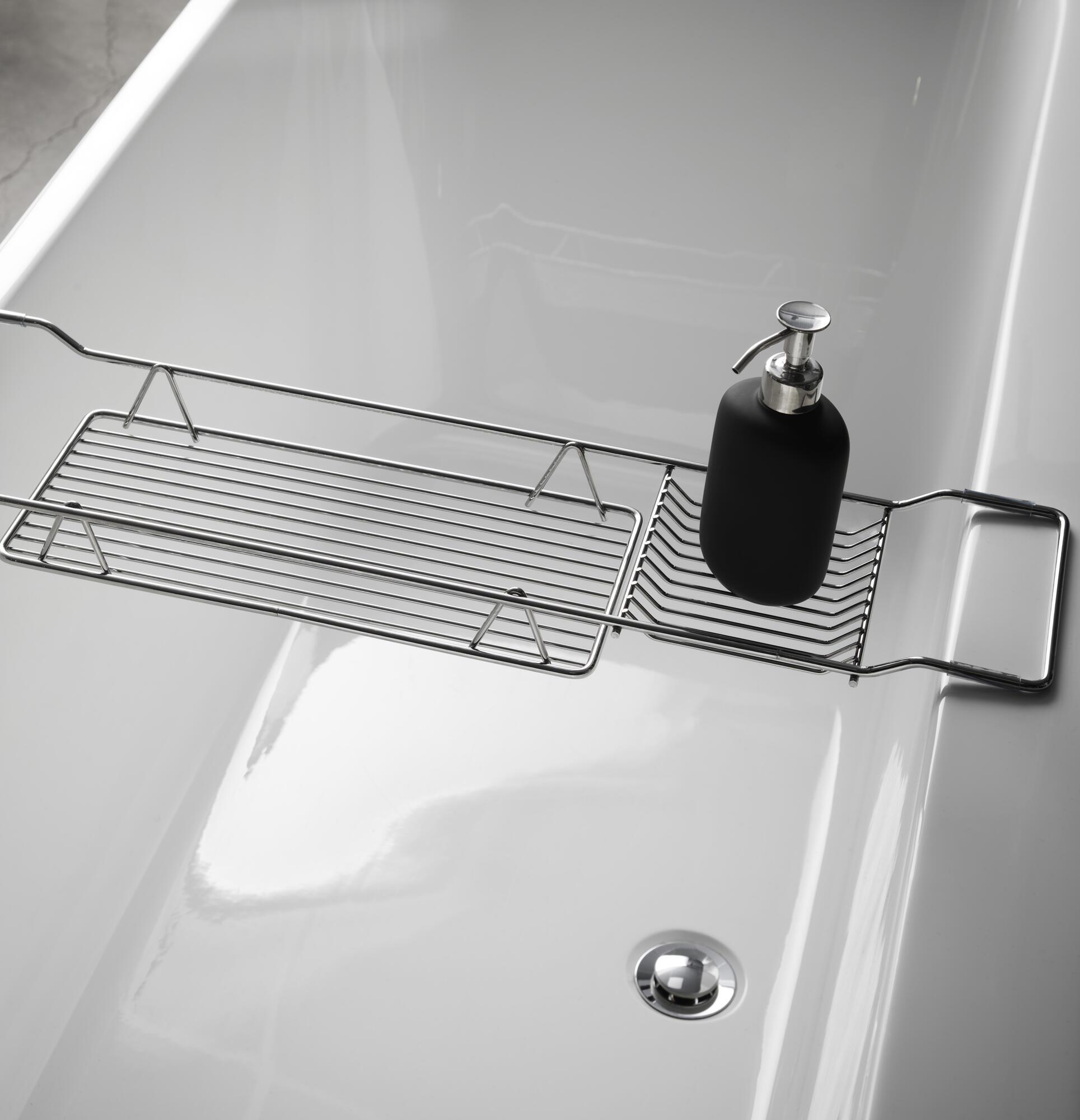 Badekarshylde af rustfrit stål. Lægges nemt mellem badekarets kanter. Hav alt, hvad du ønsker, lige ved hånden og forøg følelsen af et varmt afslappende bad. 680x160x70 mm. 3 Års rustbeskyttelsesgaranti.