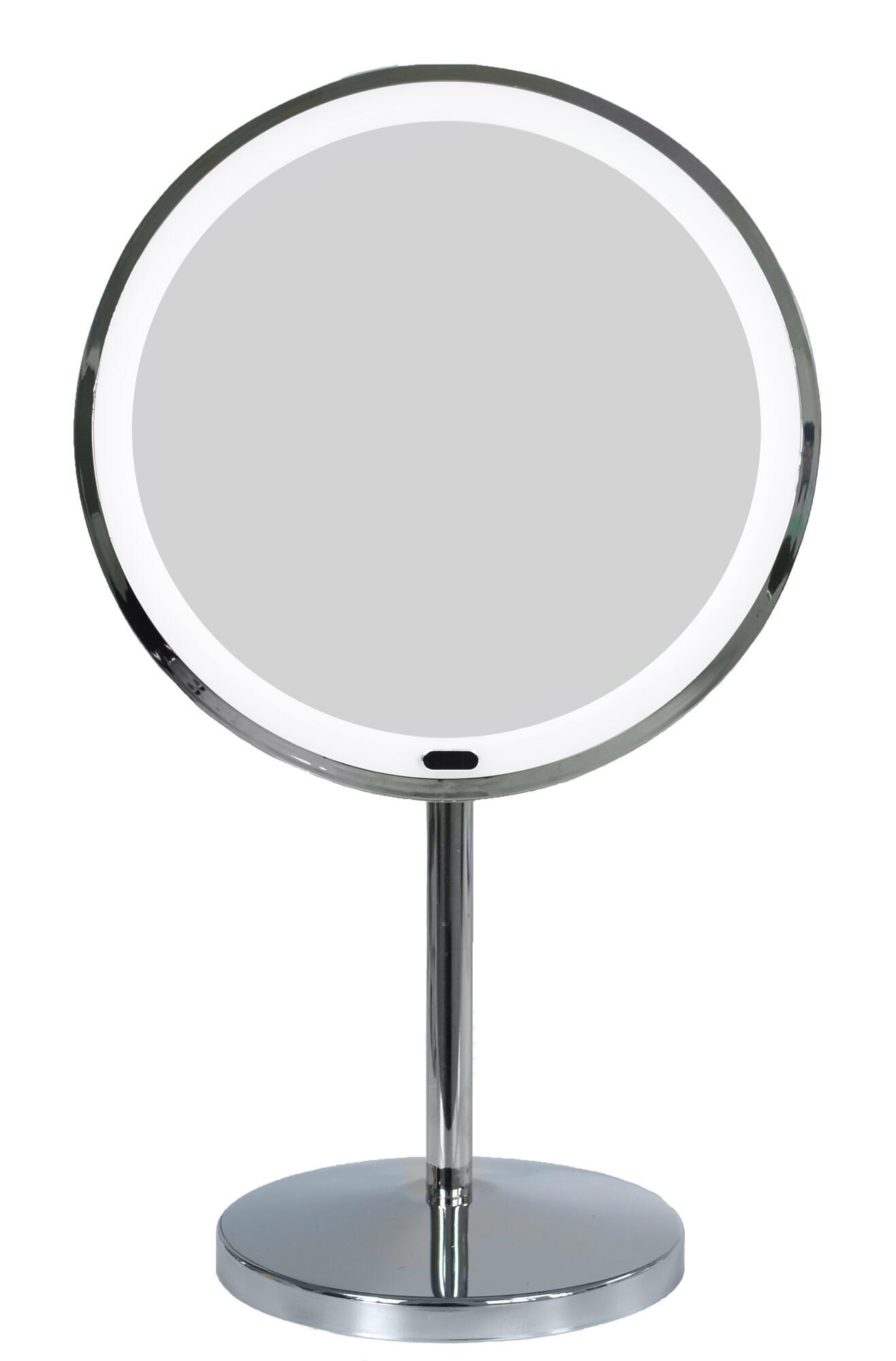 Make-up spejl med bordstativ. Spejlet har 5 gange forstørrelse. Spejldiameter 167 mm, med ramme 200 mm. Led-belysning i rammen, der oplyser detaljerne i spejlet. Belysningen drives af det medfølgende usb-kabel eller med batterier, medfølger ikke.
